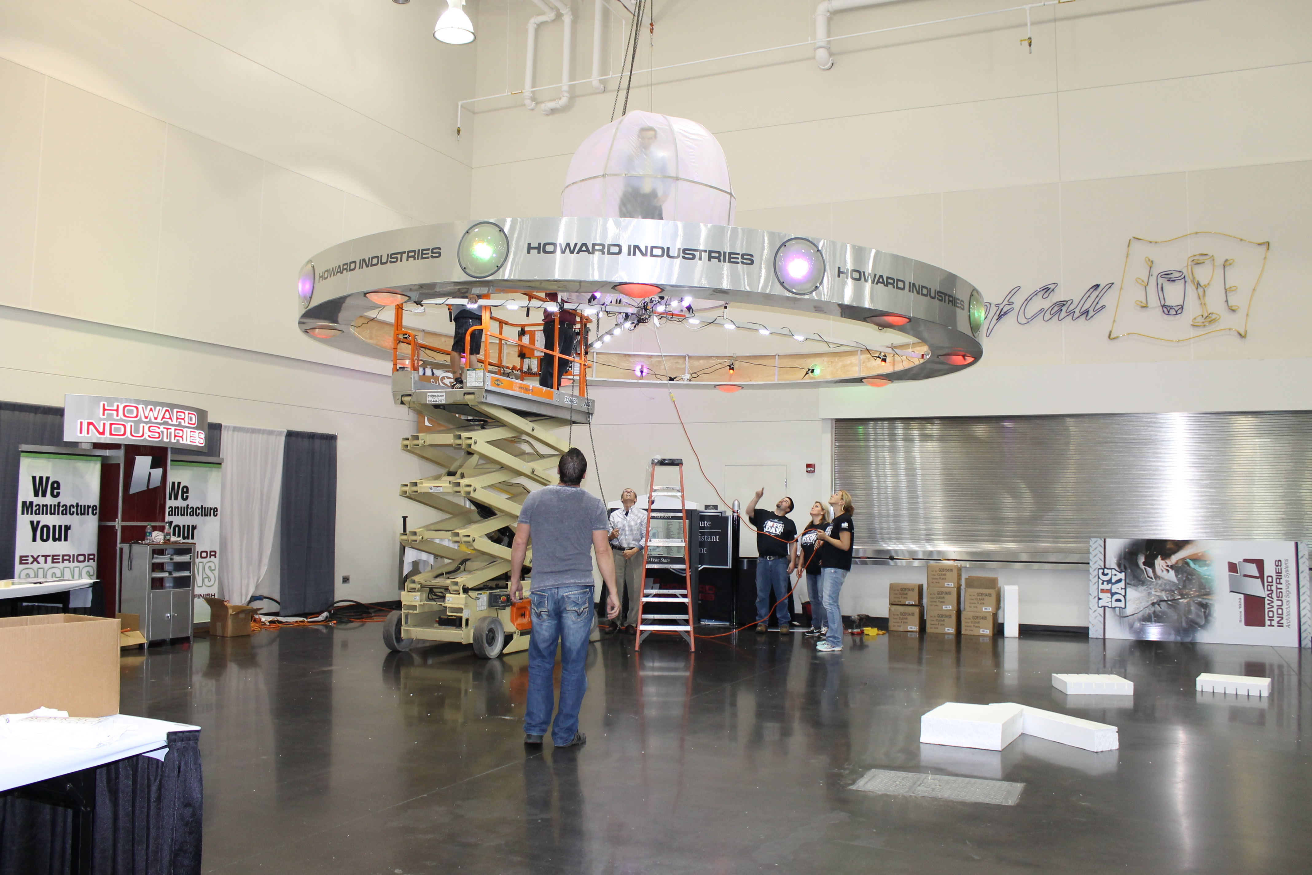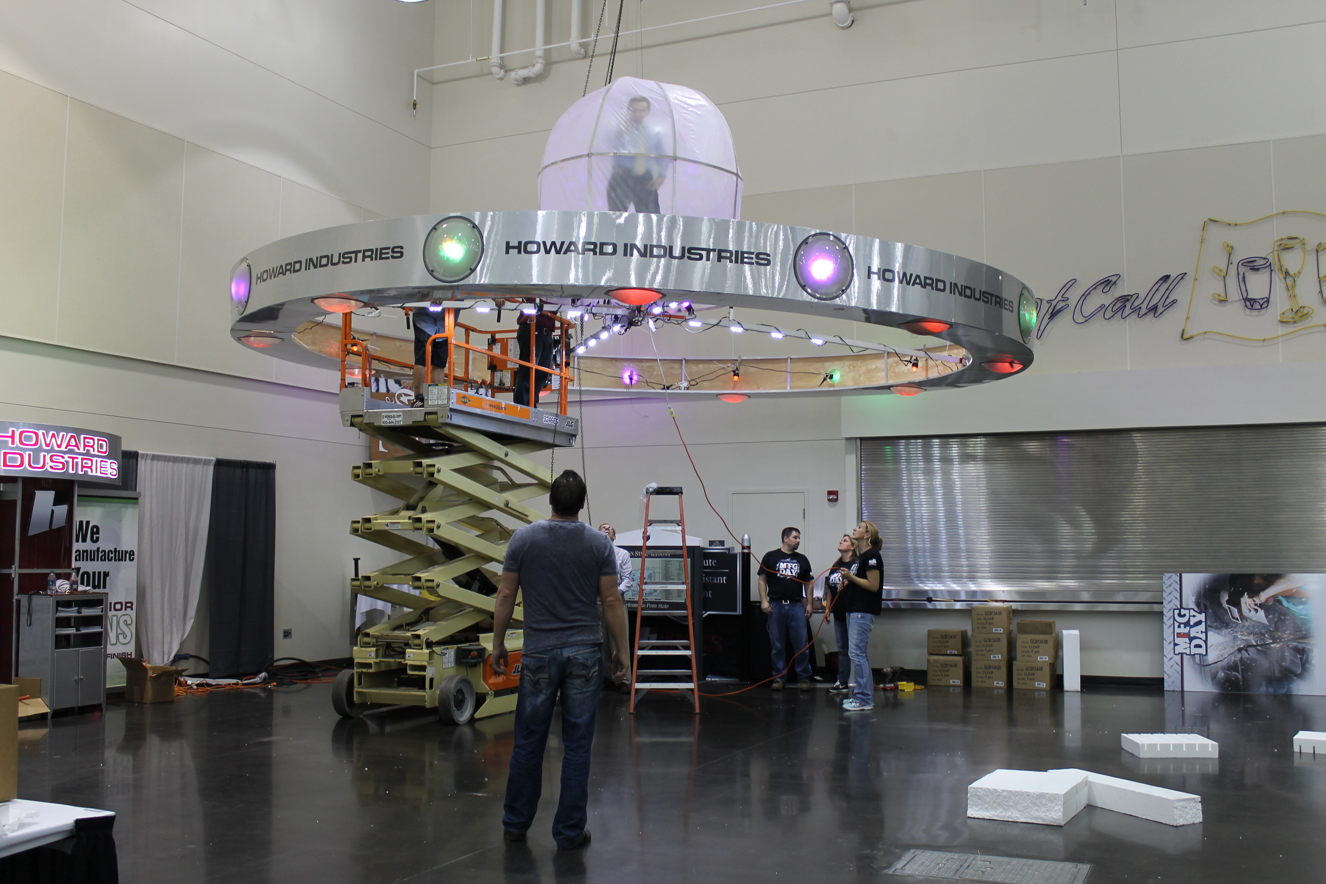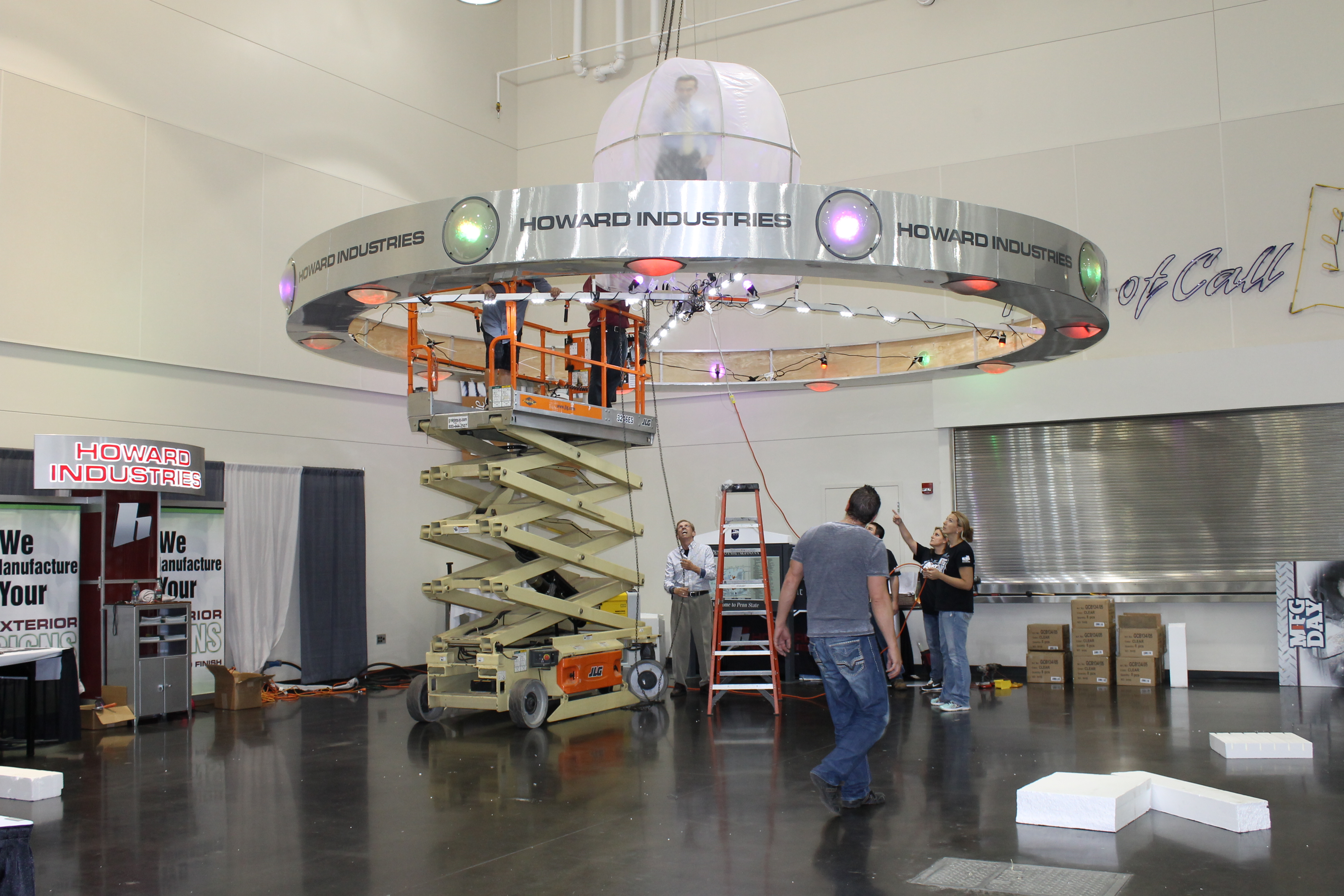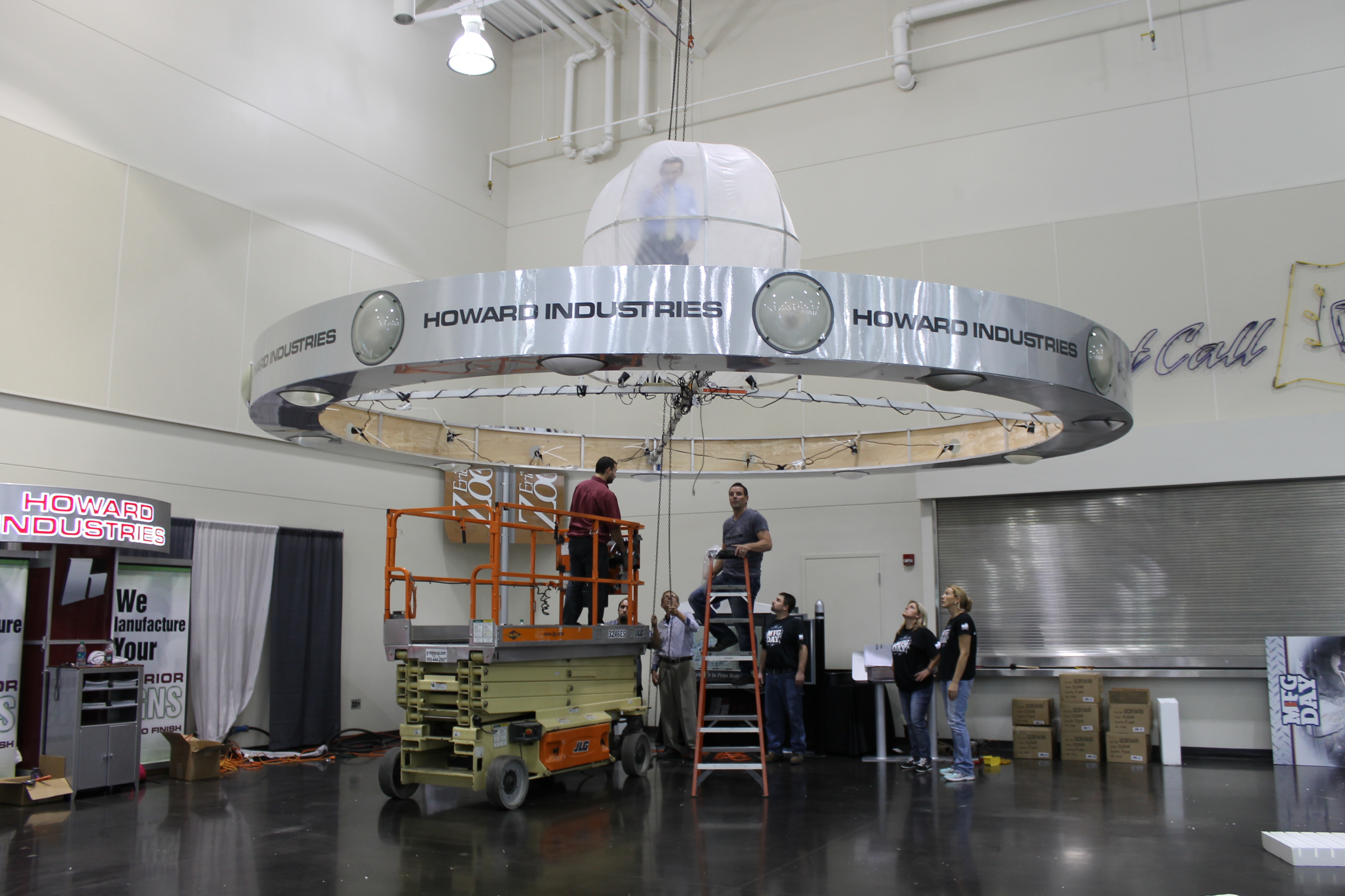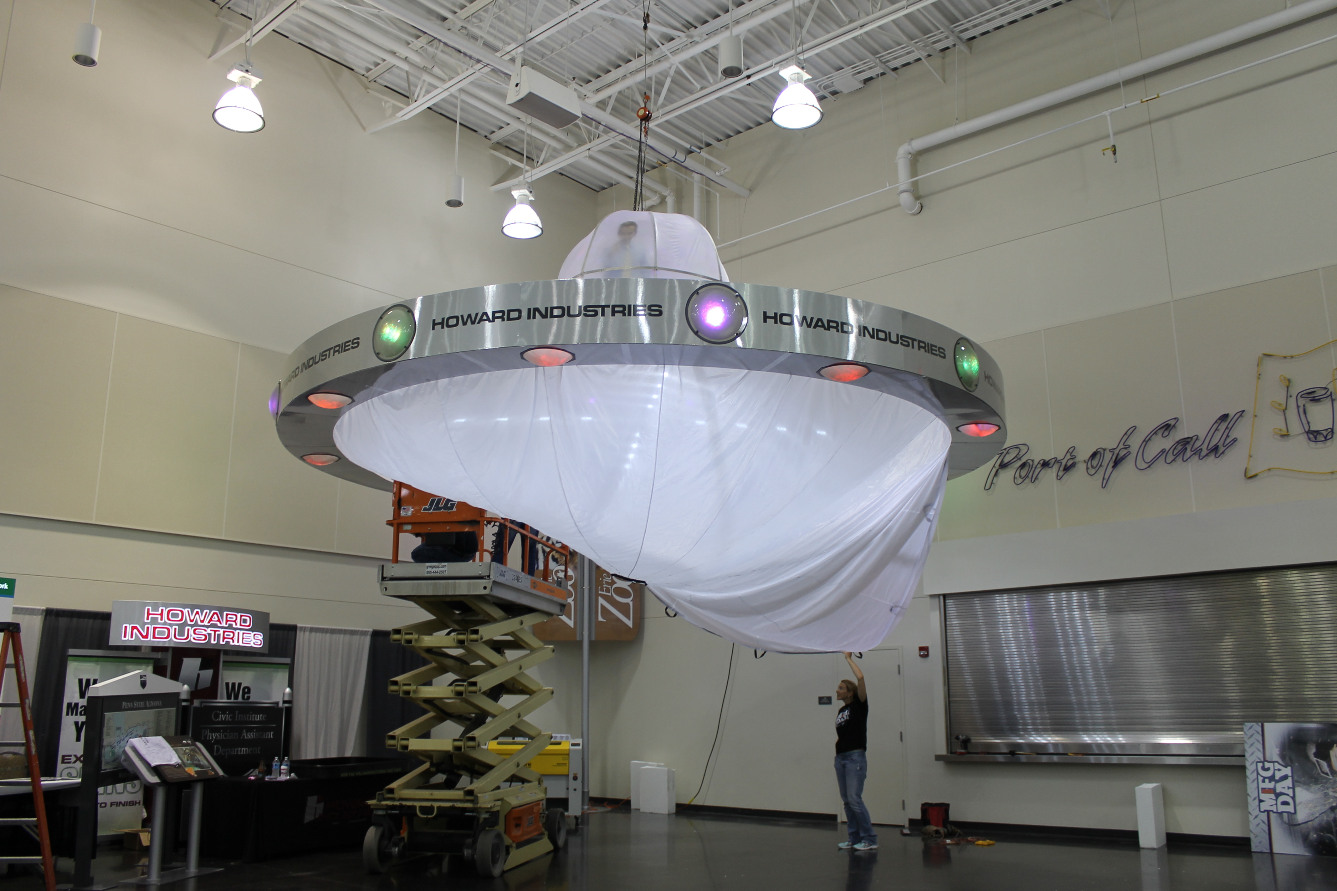 In preparation for the October 5th Manufacturing Day Celebration, Howard Industries conceived an exhibiting theme that involved a 22 foot diameter UFO. Our intention was to peak and engage the interest of attending students with the conceptual idea – “How Far Will Manufacturing Take You?” and then apply this concept to the many career opportunities the signage manufacturing industry has to offer. Follow along with the photos below to see how this spectacle was manufactured by our team!