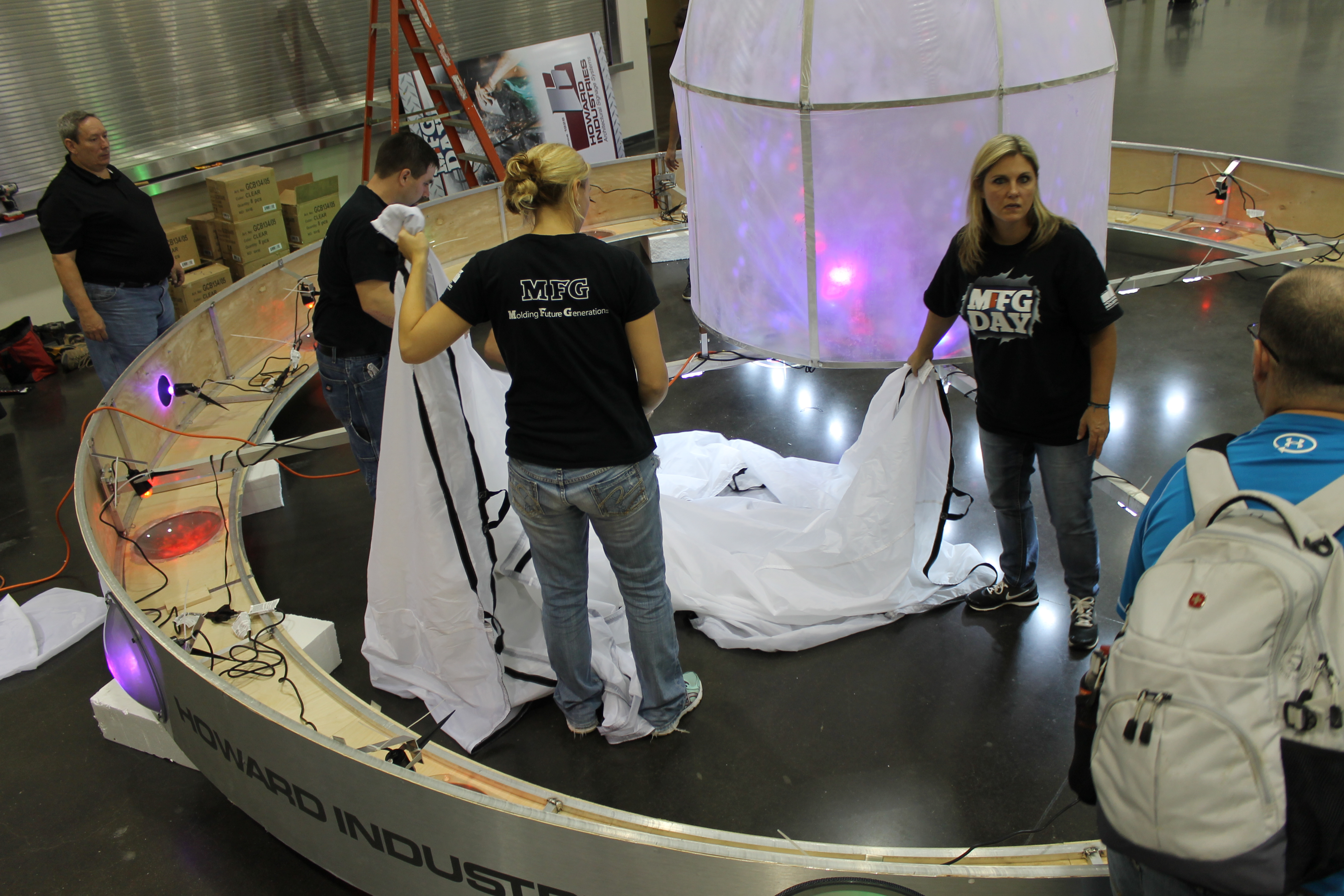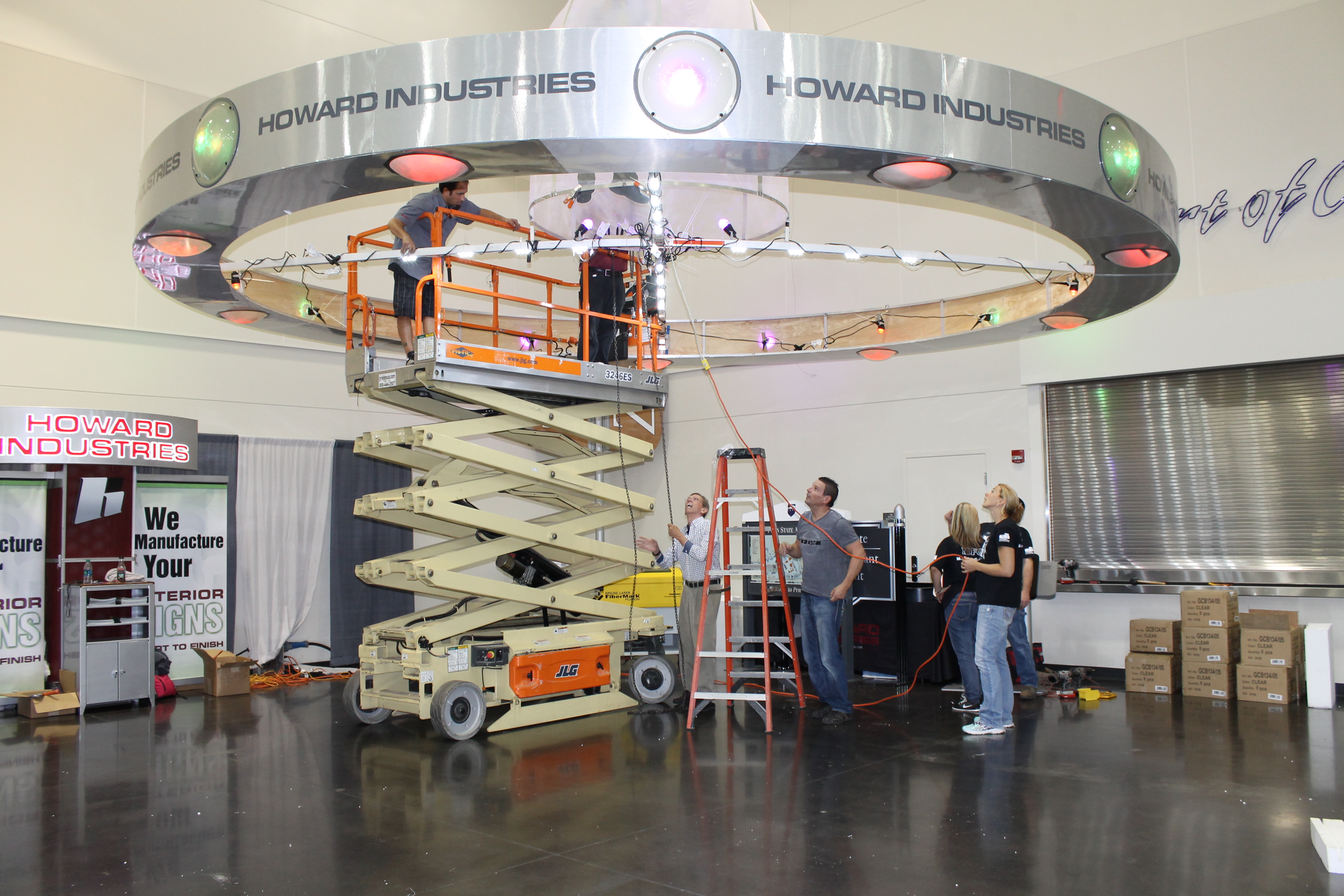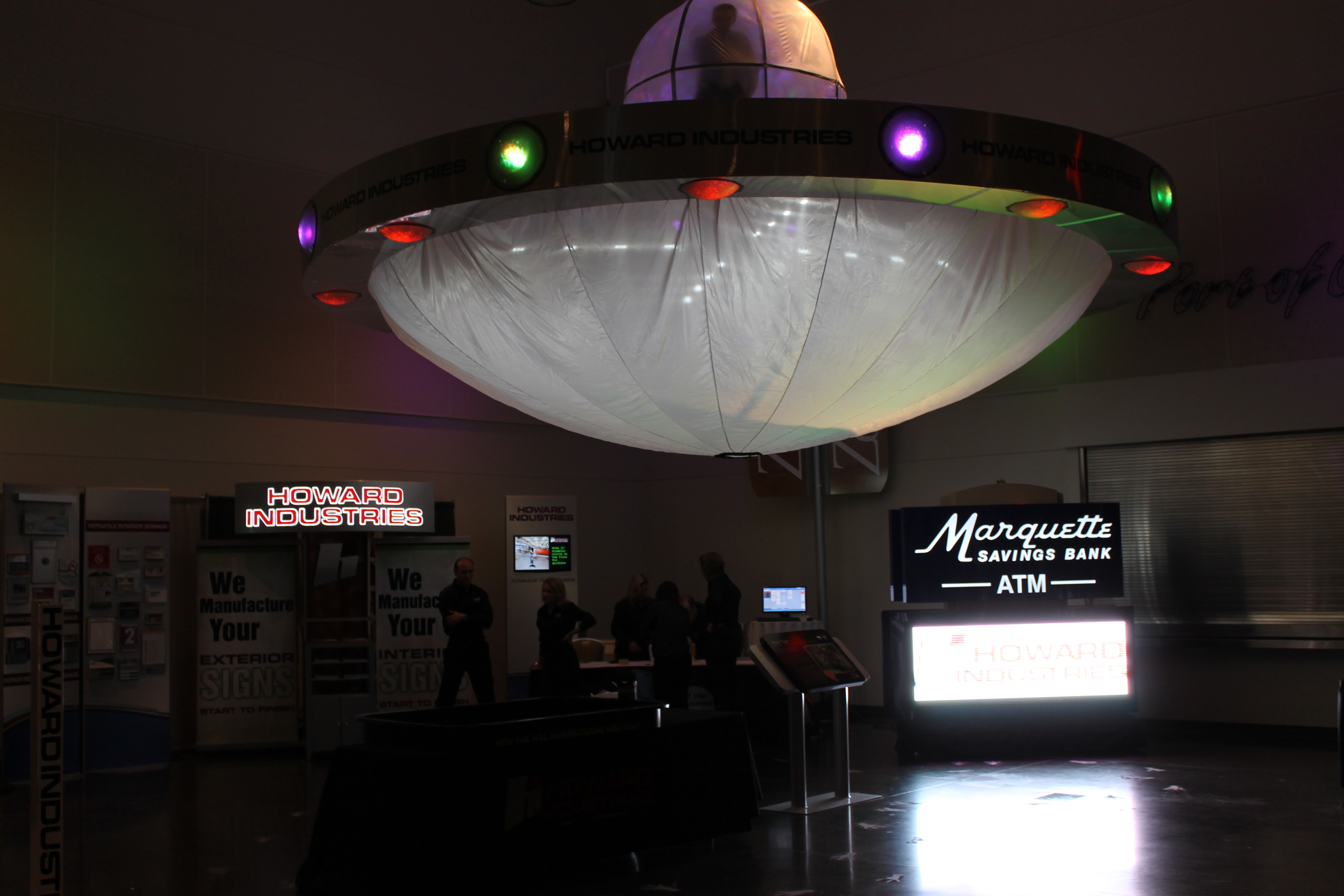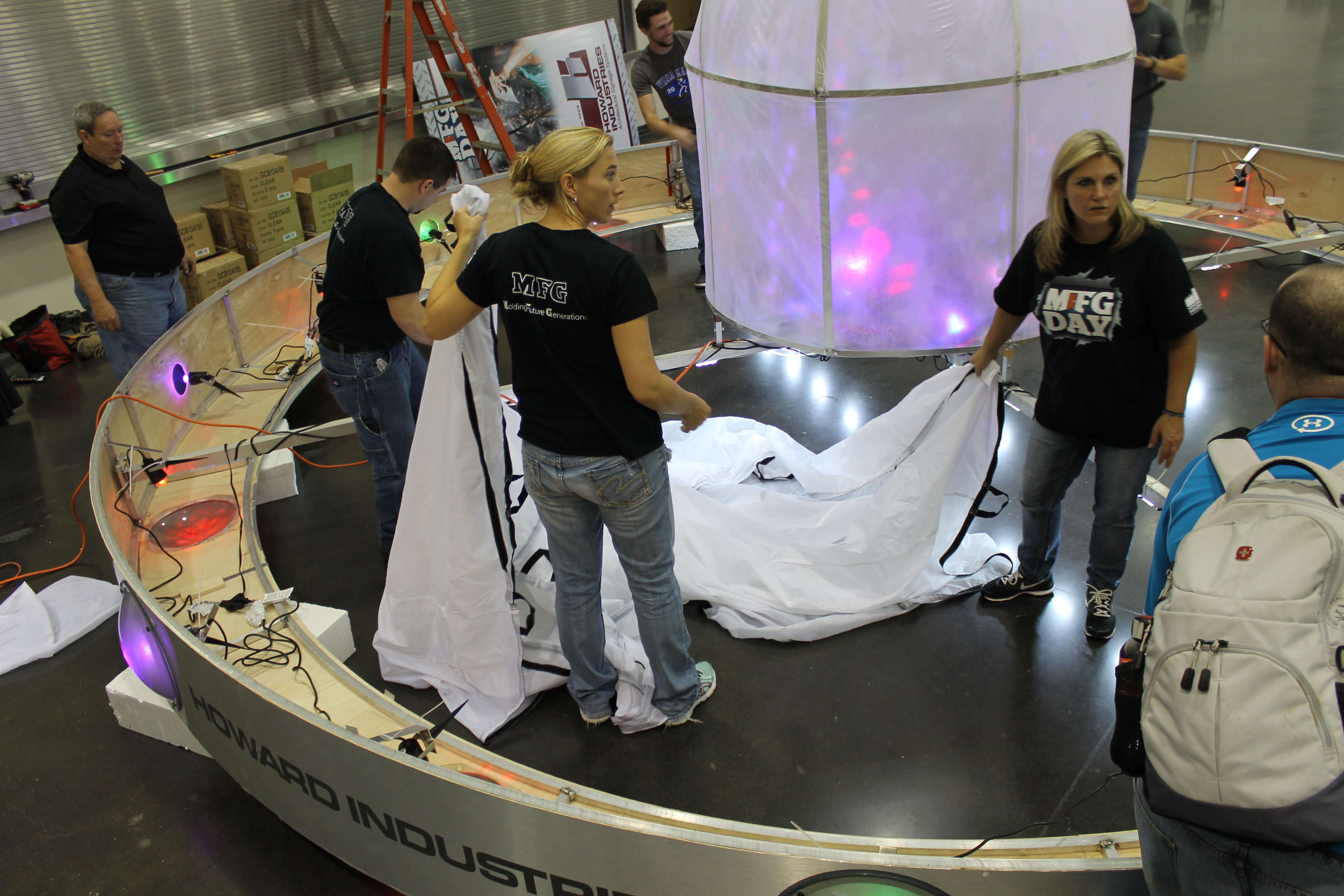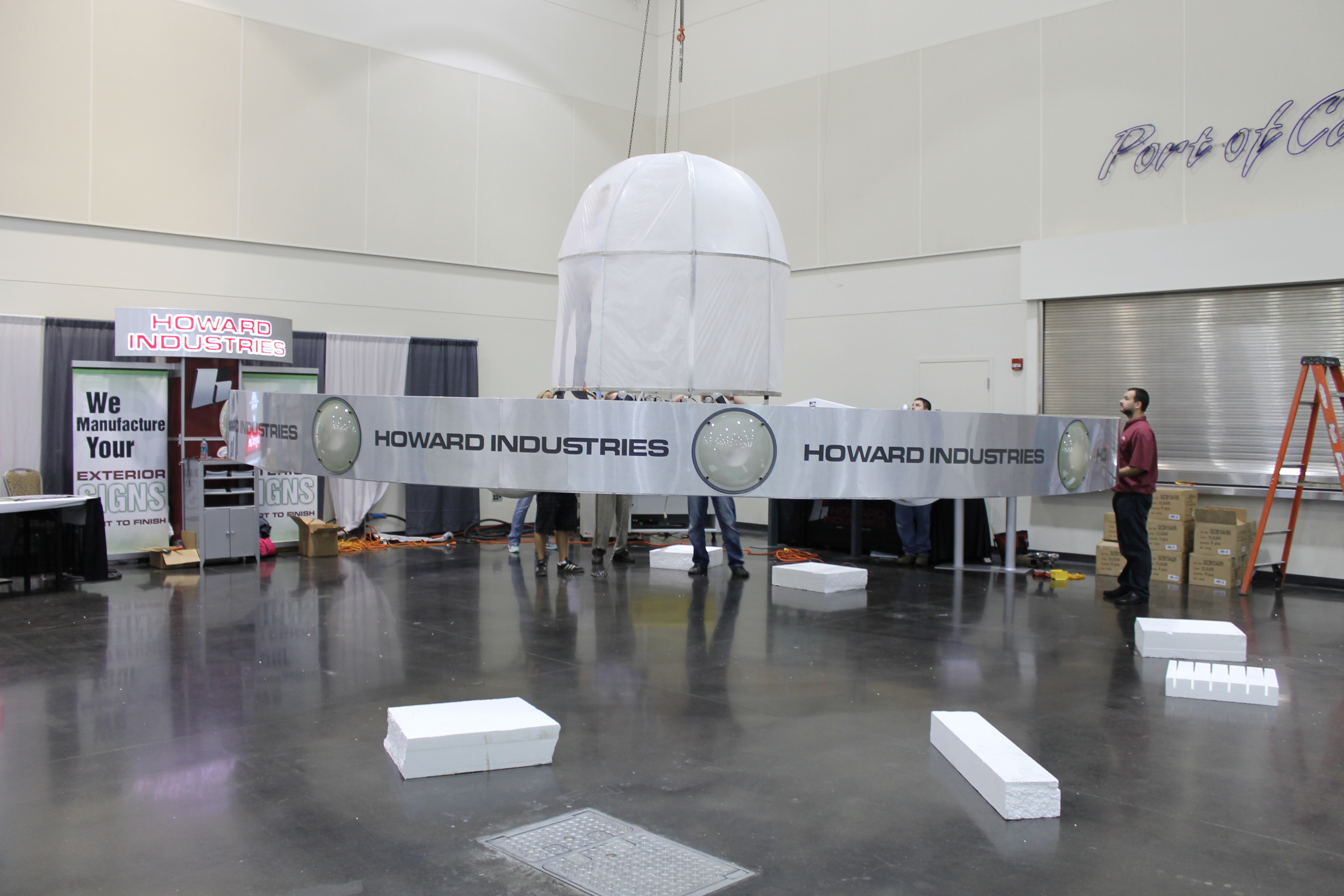 In preparation for the October 5th Manufacturing Day Celebration, Howard Industries conceived an exhibiting theme that involved a 22 foot diameter UFO. Our intention was to peak and engage the interest of attending students with the conceptual idea – “How Far Will Manufacturing Take You?” and then apply this concept to the many career opportunities the signage manufacturing industry has to offer. Follow along with the photos below to see how this spectacle was manufactured by our team!