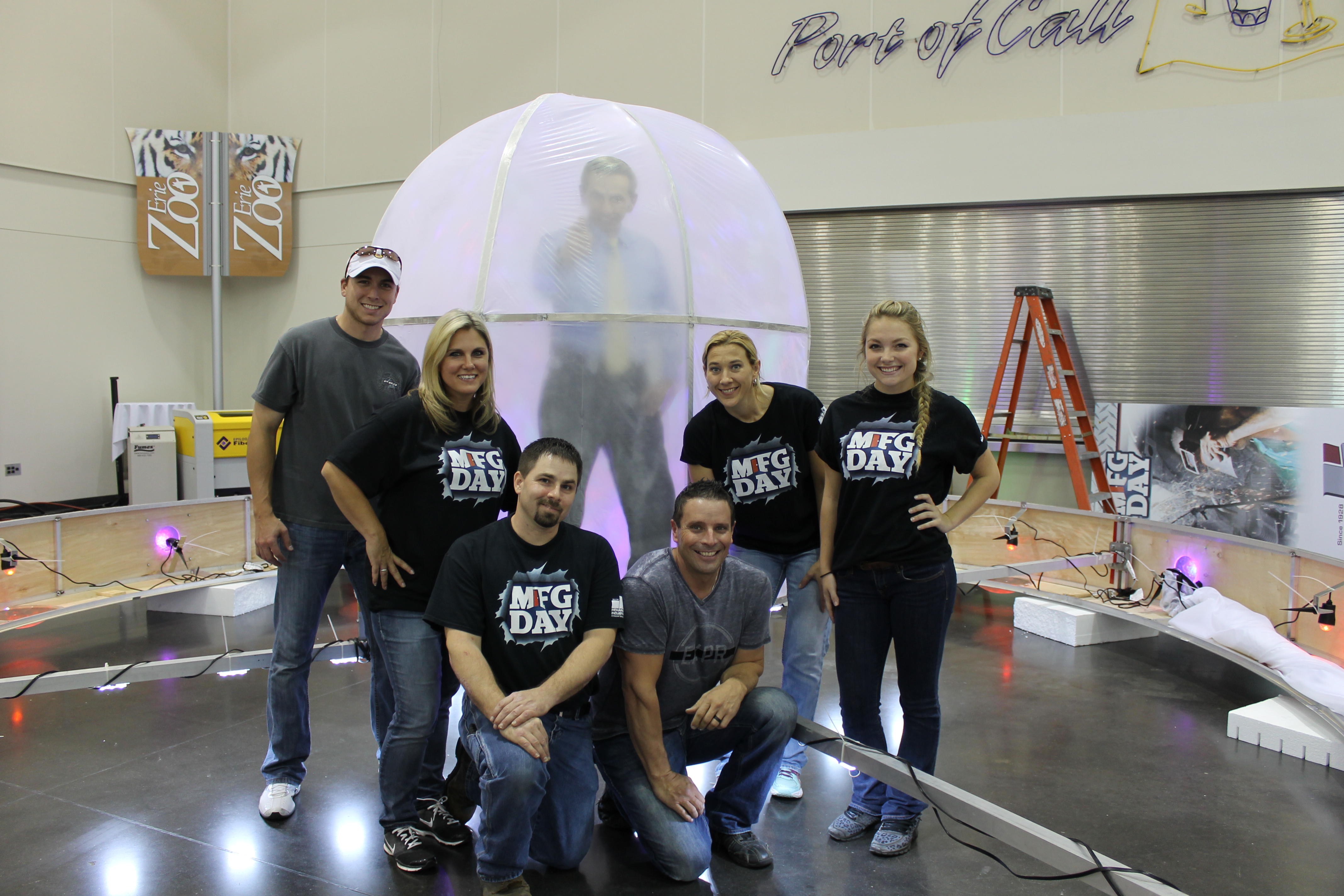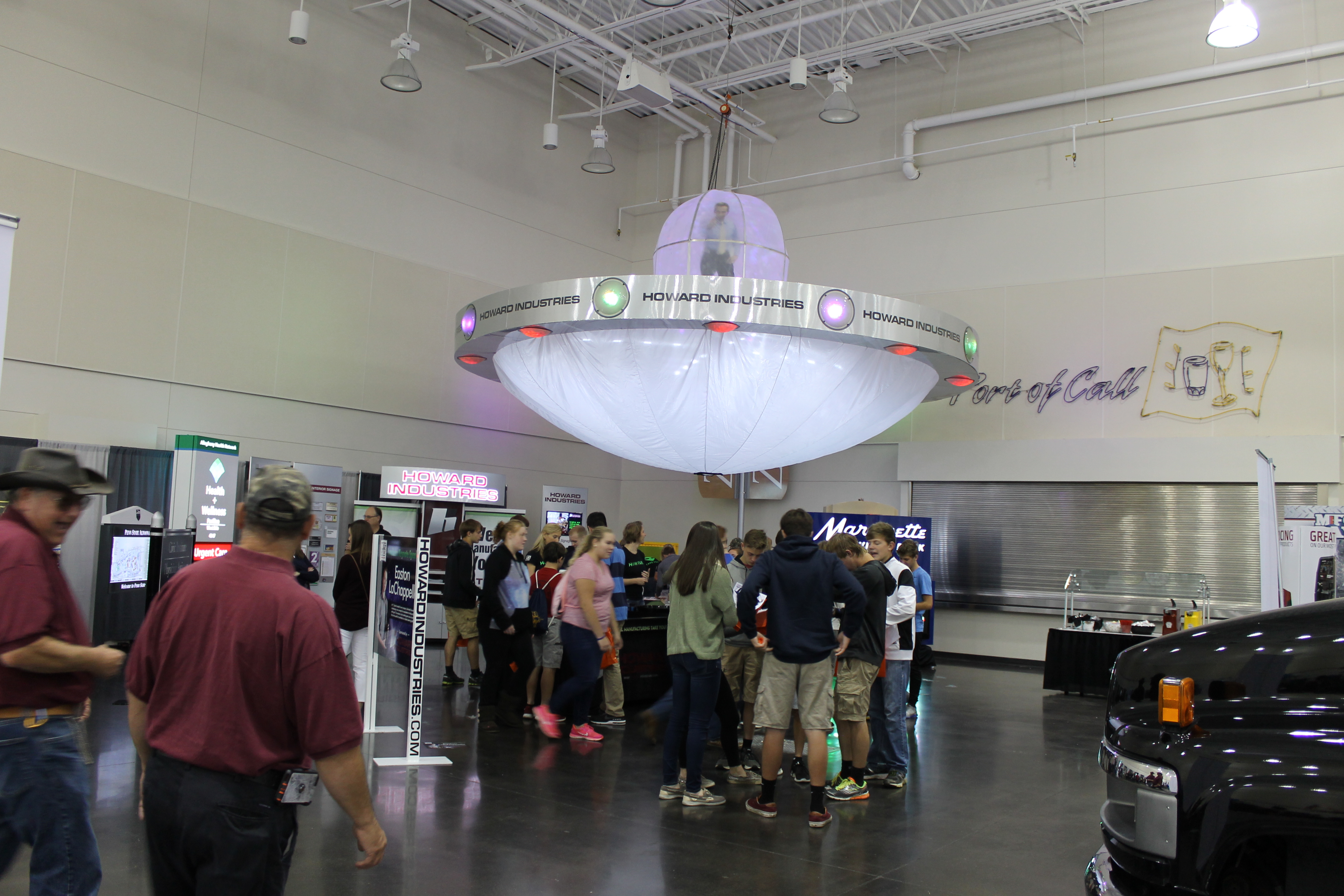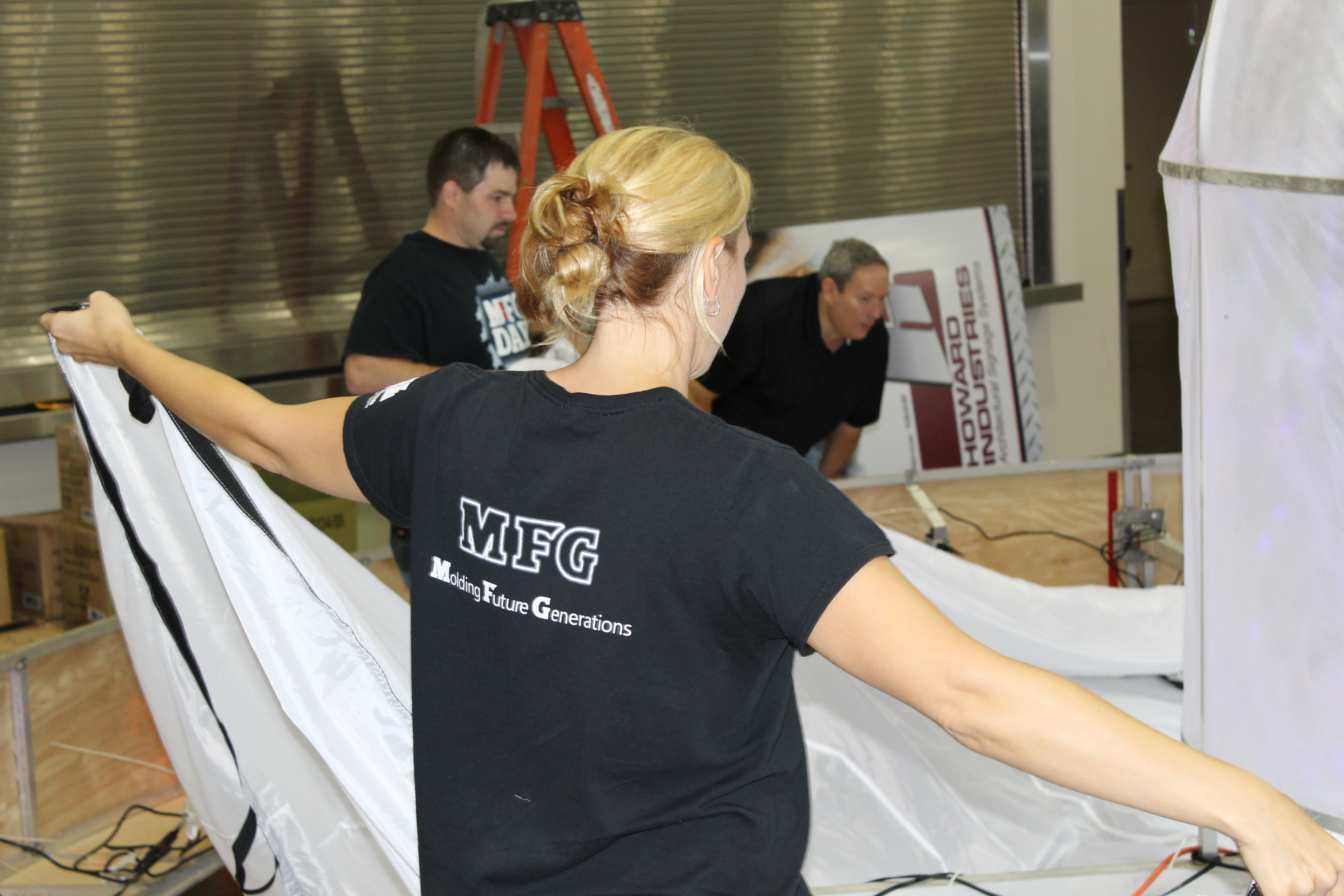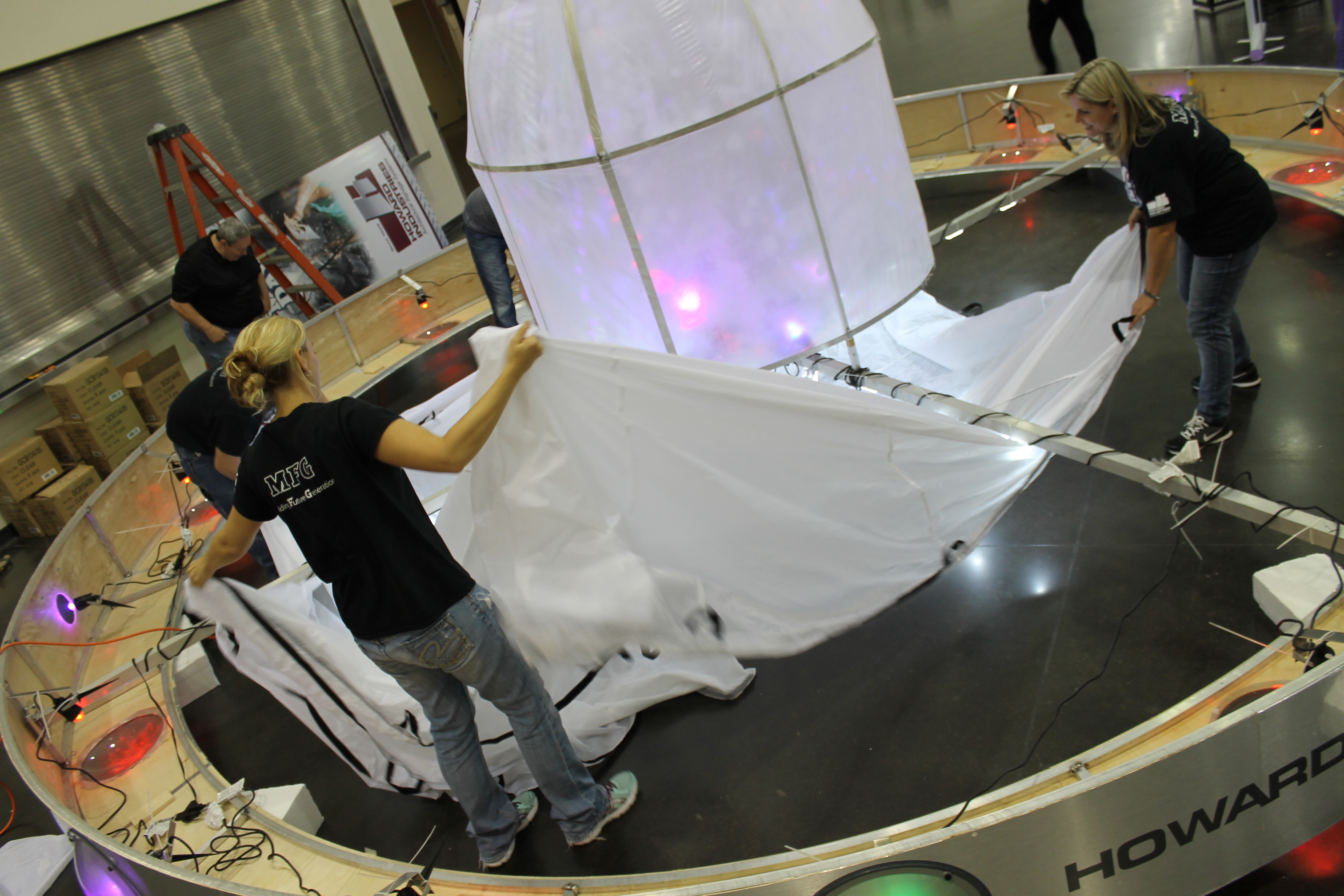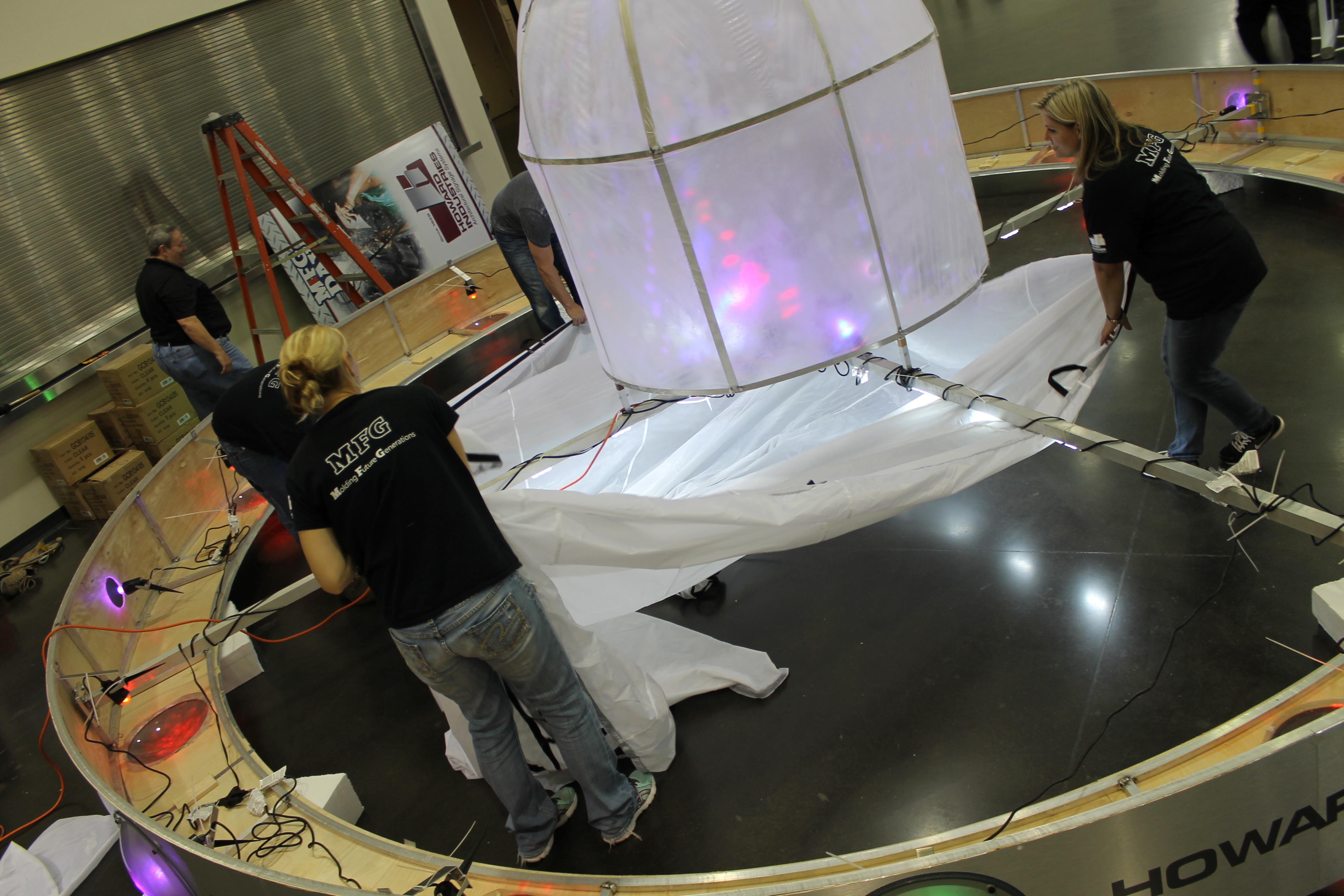In preparation for the October 5th Manufacturing Day Celebration, Howard Industries conceived an exhibiting theme that involved a 22 foot diameter UFO. Our intention was to peak and engage the interest of attending students with the conceptual idea – “How Far Will Manufacturing Take You?” and then apply this concept to the many career opportunities the signage manufacturing industry has to offer. Follow along with the photos below to see how this spectacle was manufactured by our team!